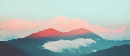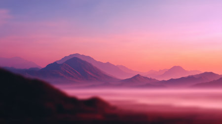 A breathtaking view of misty mountains at sunrise, showcasing soft pastel colors that create a tranquil atmosphere perfect for relaxation and appreciation of nature's beauty.