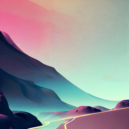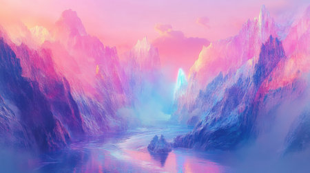 This mesmerizing surreal landscape features vibrant colors and abstract mountains, creating a dreamlike atmosphere filled with beauty and imagination.