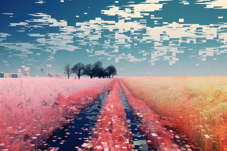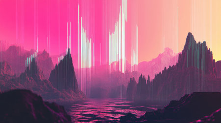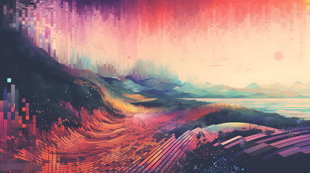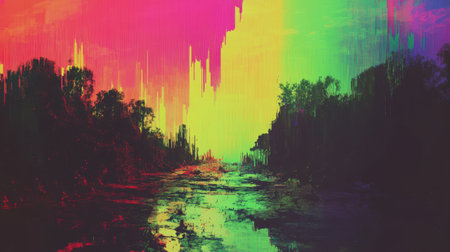 Glitch landscape with distorted natural scenery and vibrant color contrasts in digital art