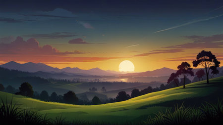 A digital painting depicts a tranquil sunset scene over rolling green hills and dark silhouette trees, with a large sun setting over distant mountains.