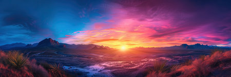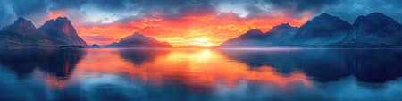 A panoramic view of the sunrise over mountains and sea, with vibrant colors reflecting on the calm waters. The sky is painted in hues of orange, pink, blue, and yellow, creating an enchanting scene that evokes feelings of awe and wonder. This photograph captures the beauty of nature's grandeur at dawn, offering viewers a stunning visual experience. --ar 119:30 --stylize 750 --v 6.1 Job ID: e7d621d3-484e-4971-b099-b1b8e10ce692
