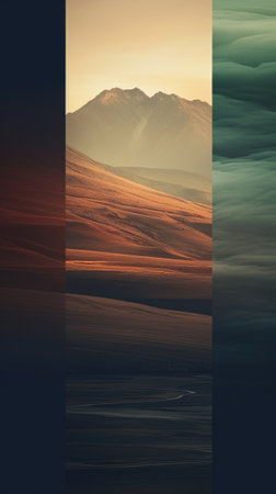 The sun rises softly behind a majestic mountain, casting a warm glow over the misty valleys. Layers of blue and orange hues blend in the sky, creating a tranquil atmosphere in nature.