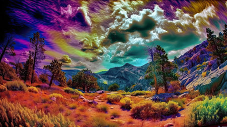 A psychedelic journey through an otherworldly landscape, where nature and cosmos merge in a vivid explosion of color. Surreal mountains rise under a hallucinatory sky, adorned with celestial bodies and ethereal lights, invoking the boundless realms of imagination and the allure of a 'mushroom trip' without boundaries.