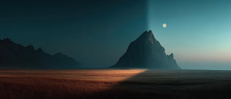 A dramatic landscape features a towering mountain illuminated by moonlight with a serene field in the foreground during twilight hours.