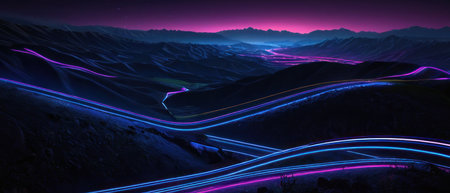 futuristic landscape with smooth, dark, undulating hills in the background with neon light trail