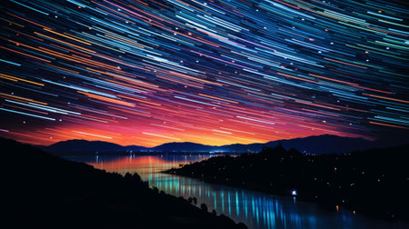 A breathtaking view of a vibrant sunset reflecting on calm water, showcasing colorful light trails. The tranquil atmosphere invites serene contemplation and exploration.