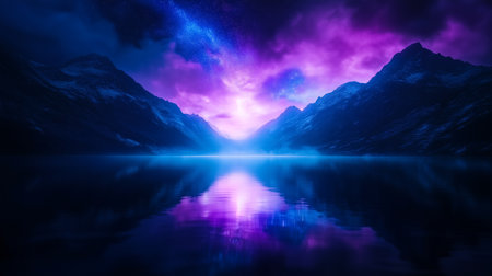 stunning landscape featuring majestic mountains and serene lake, illuminated by vibrant purple and blue sky filled with stars. reflection in water enhances ethereal beauty of scene.