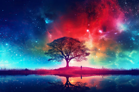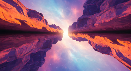 A breathtaking surreal landscape featuring towering canyons reflected in calm water, under a vibrant cosmic sky with a bright light source at the horizon.