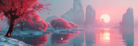 Landscape panorama with rocks and water in 3D. Abstract fantastic background. Red sunset light illuminates the landscape.