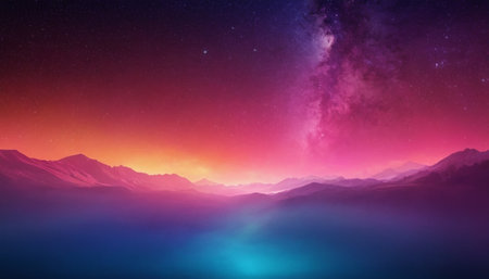 Landscape photography, Neon landscape with a large mountain peak and a river reflecting neon lights under a large, pink and blue glowing sun with stars, 80s Aesthetic Background.Surreal dreamlike landscape. Concept of nature, fantasy, and dreams, studio lighting, 4k images, Canon EOS R5. --ar 2:1 --style raw --sref 1000003 --stylize 400 --v 6.1 Job ID: 5ca24302-ab4c-4d9a-b90a-7159f2c1895d