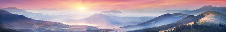 sunrise, the sun's rays illuminate the beautiful panorama of the Carpathian village against backdrop of scenic mountains, where the highlanders live Hutsul. Wild forests, fields pastures
