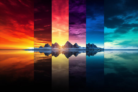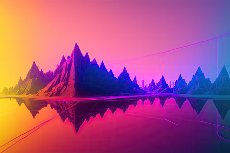A serene landscape depicts a calm lake reflecting the vibrant colors of a sunset. The composition features mountain silhouettes against a gradient sky with hues of blue, orange, and purple. The image's smooth texture and soft lighting suggest a peaceful atmosphere, suitable for various editorial and commercial applications.