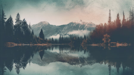 the landscape in this photo is a stunning display of manipulated photography, featuring trees and lakes on either side. the moody color schemes of light teal and light maroon give the image a whistlerian feel, while also evoking the frostpunk aesthetic. the reflections and mirroring in the lakes add a sense of depth and complexity to the image, creating a feeling of faded memories. overall,