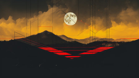 a black and red graphic featuring a cyberpunk dystopian mountain and sunrise scene. this historical illustration by nicolas bruno combines abstract lines and elements of cartelcore. the low resolution adds to the gritty atmosphere, reminiscent of the works of charley harper. the panoramic view captures the vastness of the landscape. ai generated