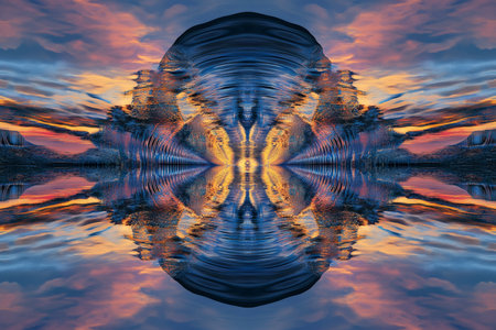 A surreal water reflection effect with inverted sky and deep, infinite ripples in a twilight setting.