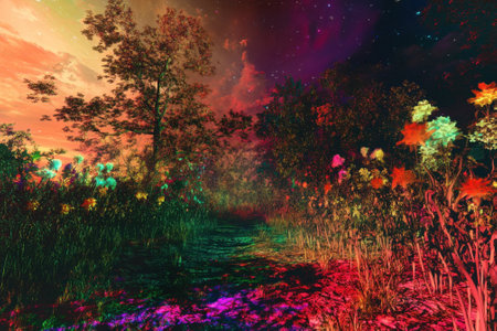 Colorful flowers and trees line a serene path under a twilight sky filled with stars.