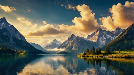 Mountain lake. Panoramic view. Dramatic sky. Beauty world.