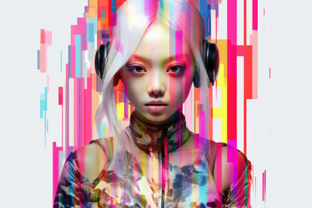 Futuristic abstract portrait of smart woman looking at camera with digital glitch with vibrant neon light. Young beautiful female staring at camera represent digital robotic simulated human. AIG42.