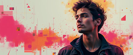 A stylish young man with tousled hair gazes thoughtfully into the distance, set against a dynamic abstract backdrop of vivid pinks and geometric shapes. This striking image captures a moment of introspection, blending modern artistry with youthful energy and creativity.