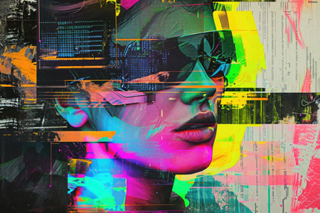 The close up picture of human face with emotionless expression that the picture has neon glitch effect that feels like from scifi or science fiction futuristic cyberpunk artstyle yet dystopia. AIGX01.