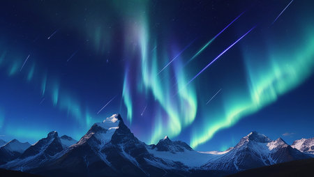 Majestic mountains under the vibrant Northern Lights with a starry sky background showcasing vivid colors