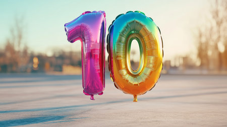 Colorful foil balloons in the shape of number ten floating outdoors in soft sunlight, celebration concept