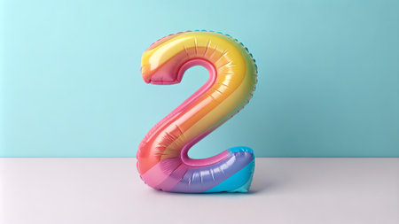 Colorful rainbow number two helium balloon in sunlight, casting shadow on neutral background. Celebration and party decoration concept