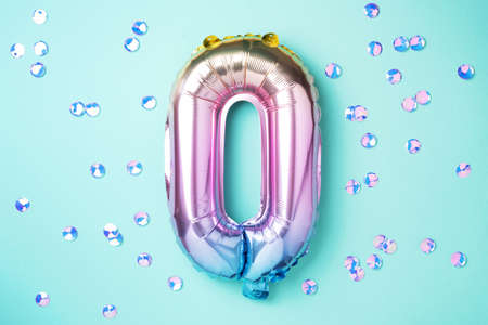 Creative layout. Rainbow foil balloon number zero 0. Birthday greeting card. Anniversary concept. Top view. Copy space. Stylish colored letter O over blue background. Digit zero