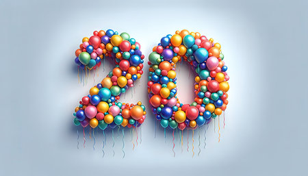 This vibrant image features the playful number 20 in bright yellow, flanked by colorful balloons, set against a soft blue background, perfect for celebrations.