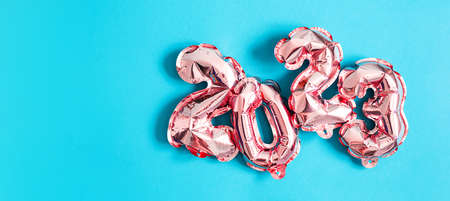 Foil pink balloons numbers 2023 on blue background. New year concept.