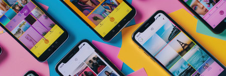 A collection of smartphones showcases engaging stories and clips on bright, colorful backdrops, capturing attention and creativity.