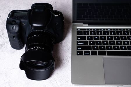 Photographer or stock photography concept, digital black camera near laptop on desk workstation