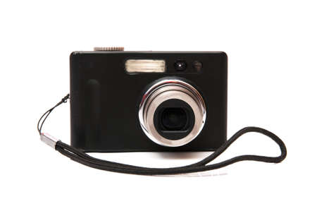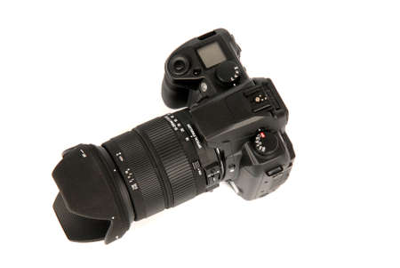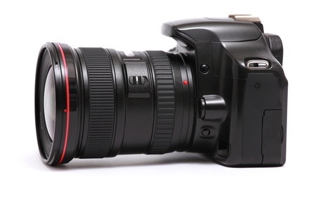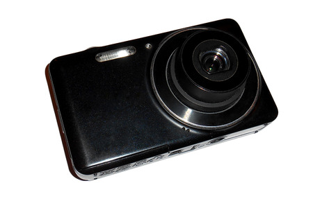 Black colored digital camera with a nice lens attached to it on top of white isolated background