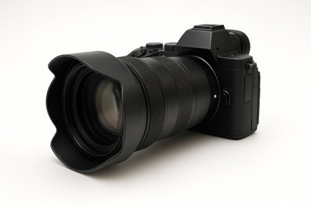 Photograph of a black colored camera with lens attached to it placed on an isolated white background