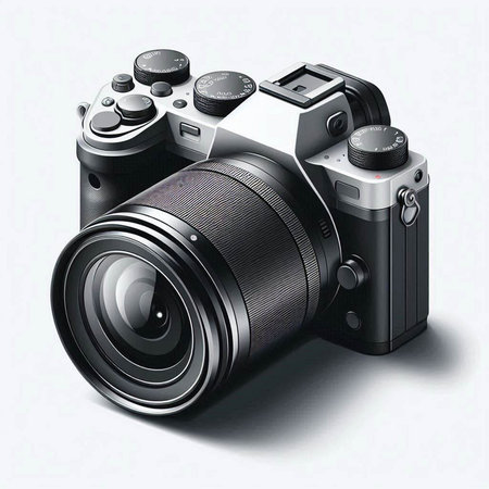 A close-up view of a contemporary digital camera, highlighting its advanced lens and sophisticated design, ideal for professional photography.