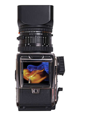 Old film photo camera on a white background. Salvador, Bahia, Brazil.