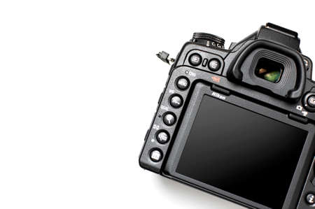 Close-up side view of a black digital mirrorless camera, blank LCD screen and control buttons, isolated on white background with full depth of field