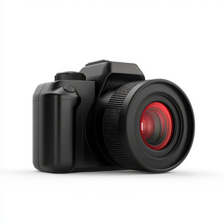 Sleek Black Digital Camera with Red Lens Detail on White Background Perfect for Photography Equipment Promotion and Marketing Purposes