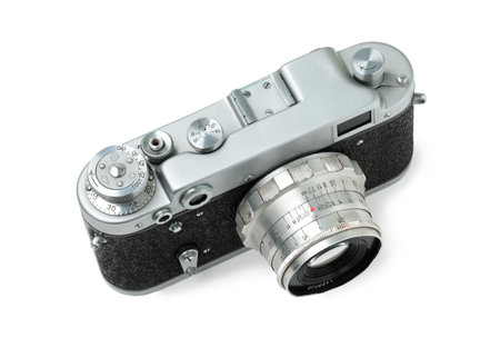 Classic analog film camera isolated on white background. Perfect for photography themes, retro designs, or creative advertising projects.