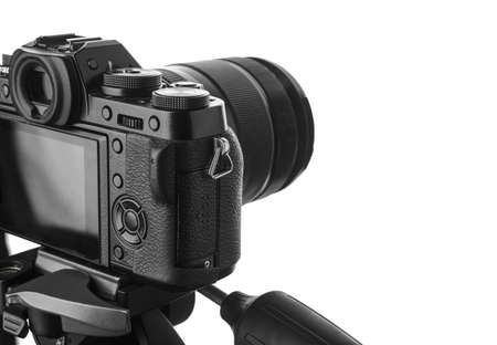 Modern digital camera rear three quarter view with large lens and tilting screen on white background for photography gear tech and product mockup themes