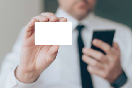 Businessman showing blank business card as mockup copy space, close up with selective focus