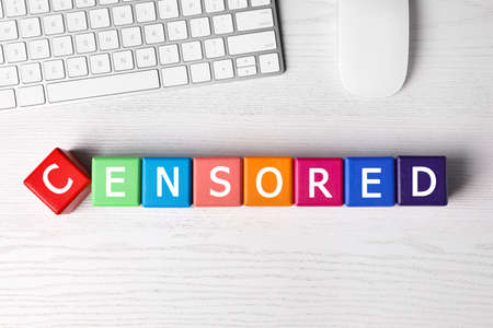 Colorful cubes with word Censored, keyboard and computer mouse on white wooden table, flat lay