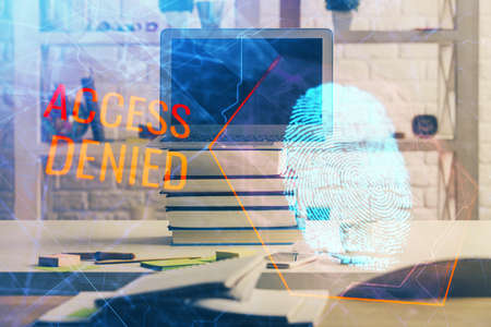 Computer on laptop in office with finger print drawing. Double exposure. Concept of business data security.