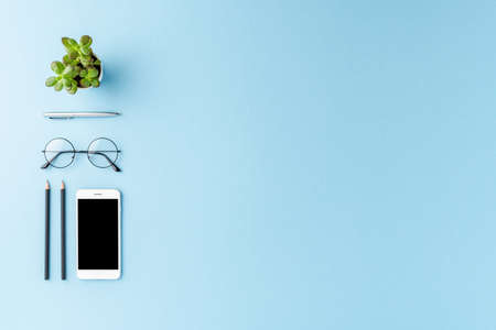 Office desktop with mobile phone and business accessories on blue background with copyspace. Flat lay