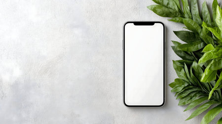 Clean mockup of a blank smartphone screen next to tropical leaves.