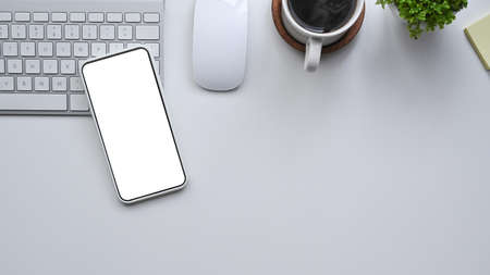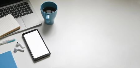Top view image of working table with accessories putting on it. White blank screen smartphone, coffee cup, wireless earphone, notebook, pen and computer laptop flat lay on white space.