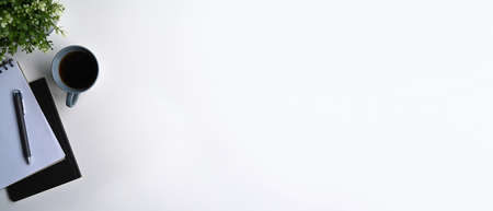 Top view coffee cup, and empty notebook on white table. Copy space.