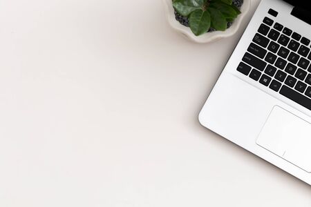 White office desk with laptop, office plant. Top view with copy space, flat lay