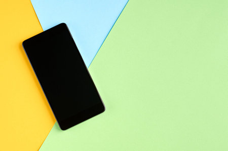 Black cellphone on yellow and blue background composition, mobile phone. Flat lay and top view photo