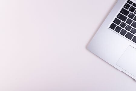 Top view of comfortable workspace with copy space and laptop computer on white table background with office supplies